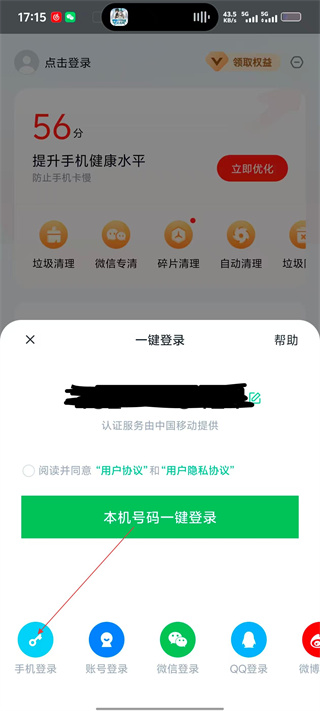 3、在登录界面可选择【本机号码一键登录】,也可切换至手机登录、账号登录等其他方式,需先勾选相关协议。