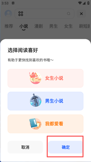 2、选择阅读喜好,点击“女生小说”、“男生小说”或“我都爱看”。