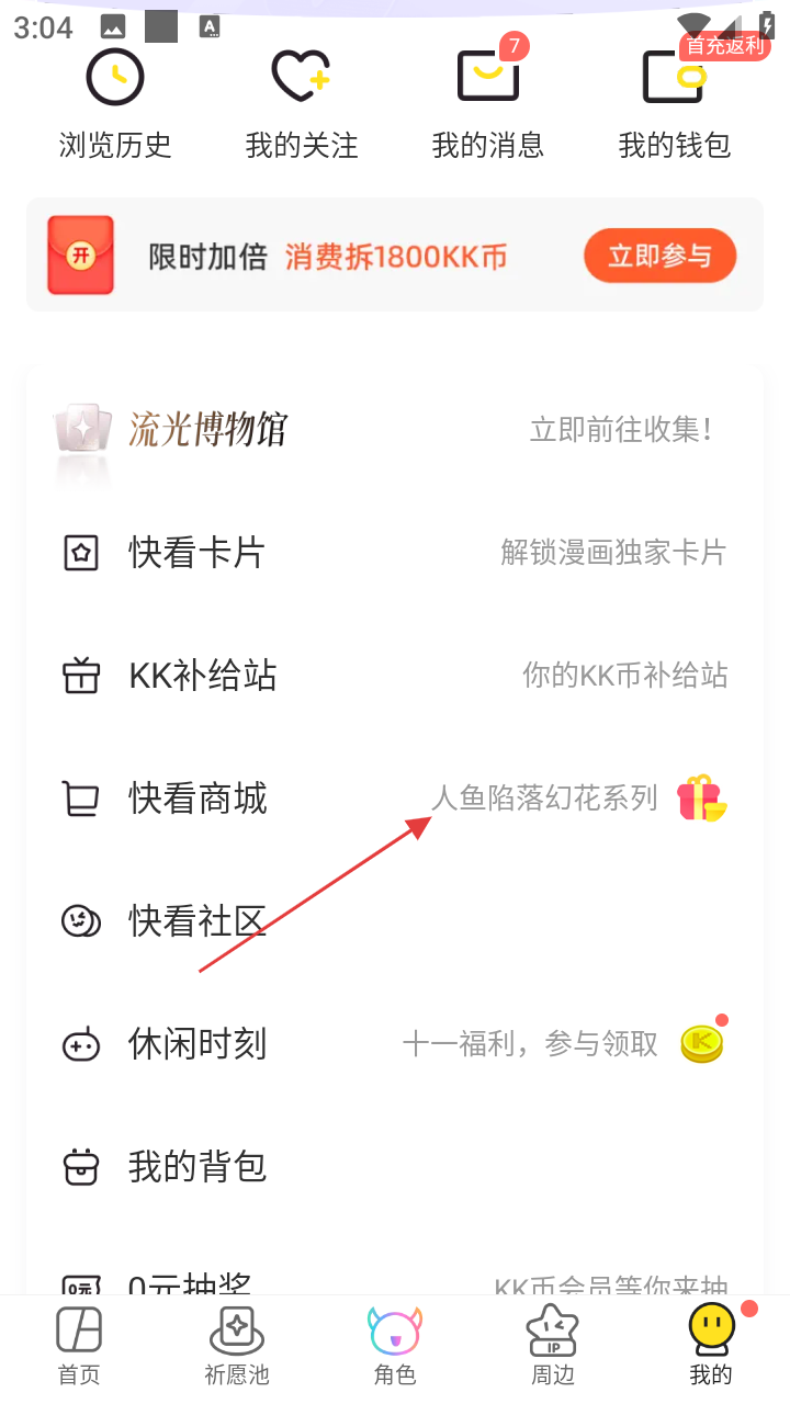 2、在个人相关页面,找到【快看商城】选项并点击,进入商城页面。
