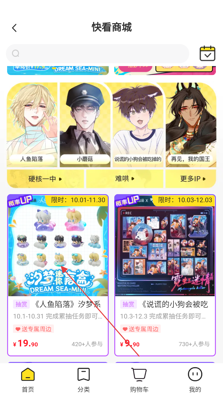 3、进入快看商城后,可看到各类商品,找到心仪的商品并点击进入详情页。