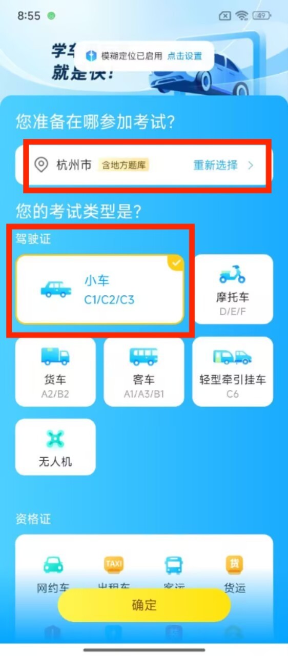1、进入初始设置页,选择考试所在城市,再选定 “小车 C1/C2/C3” 的考试类型,点击确定完成配置。