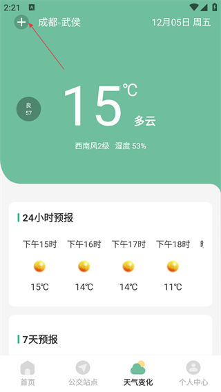 1、在APP首页,点击底部导航栏的【天气变化】选项,进入天气页面。