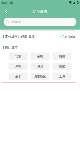 4、在切换城市页面,可选择定位城市,或从热门城市列表中选择目标城市,完成城市切换。