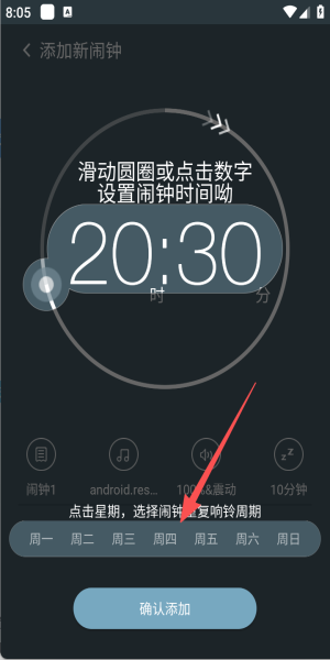4、进入“添加新闹钟”重复设置工作日时间,选择震动与铃声后确认保存。