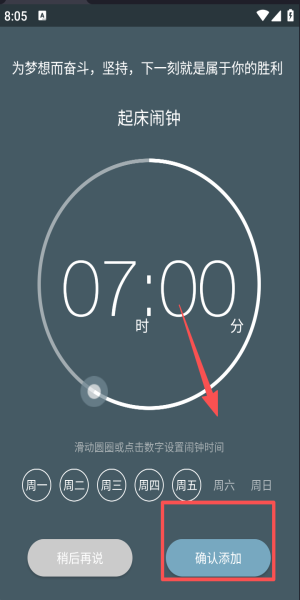 3、点击“起床闹钟”滑动圆环设定07:00,勾选周六周日稍后添加即可生效。