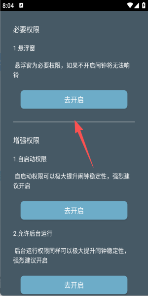 2、按提示依次开启悬浮窗、自启动与后台运行权限,确保闹钟稳定响铃。