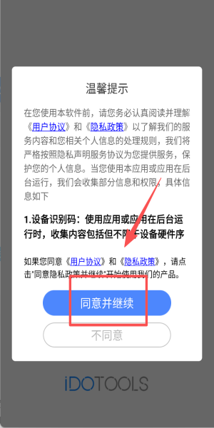 1、阅读协议点击“同意并继续”,授权设备识别码后即可进入权限设置。