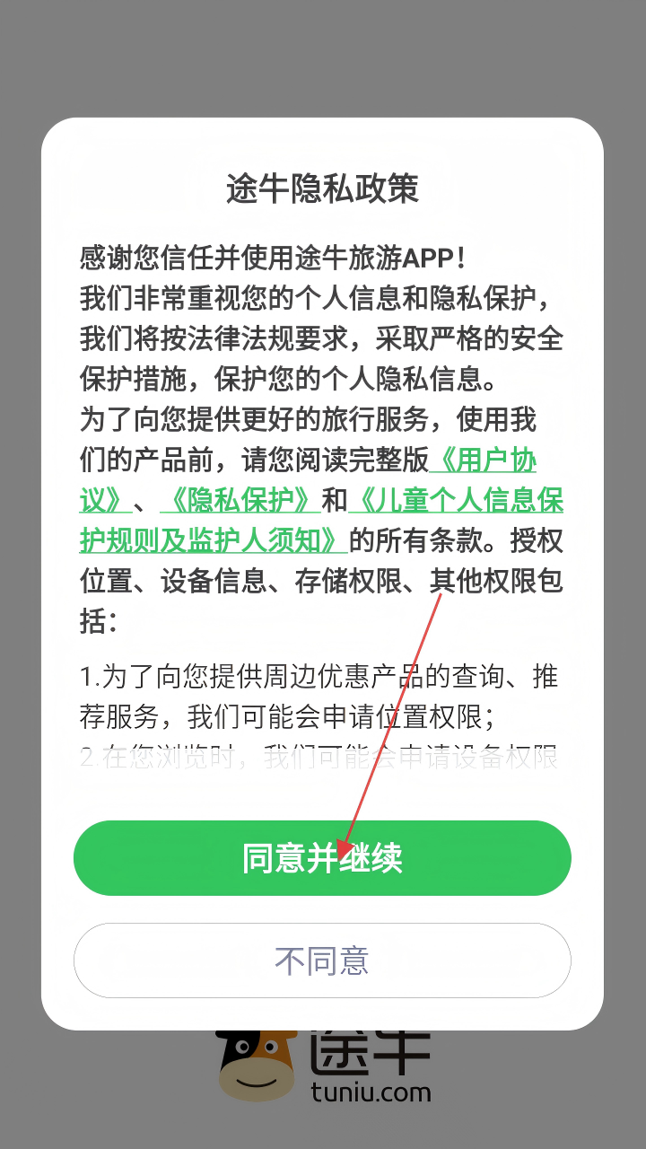 1、打开途牛旅游APP,首先弹出隐私政策弹窗,阅读后点击【同意并继续】。