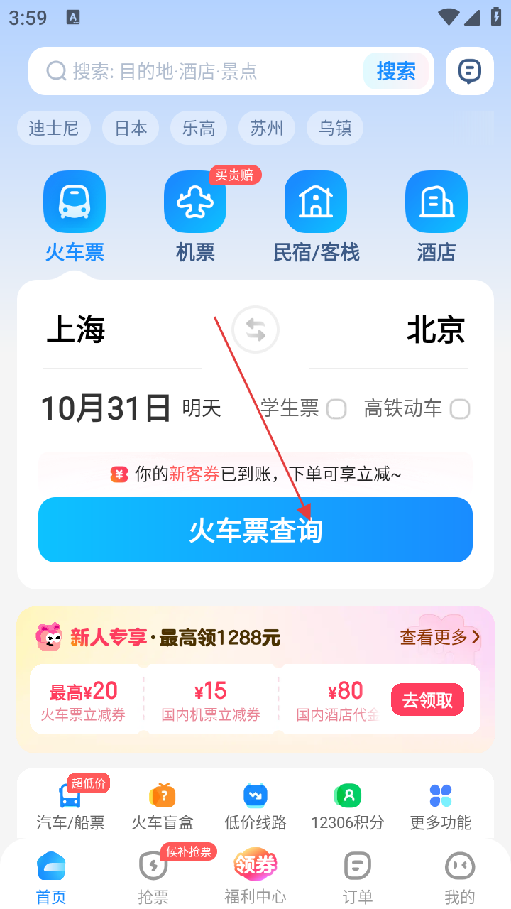 1、在出行APP首页,选择出发地、目的地和出行日期后,点击【火车票查询】。