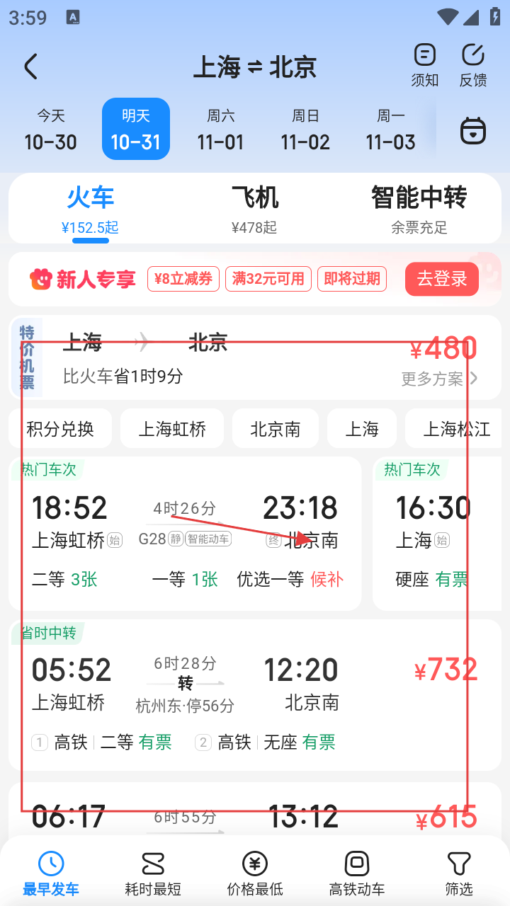 2、在查询结果页面,选择合适的车次,点击进入车次详情页面。