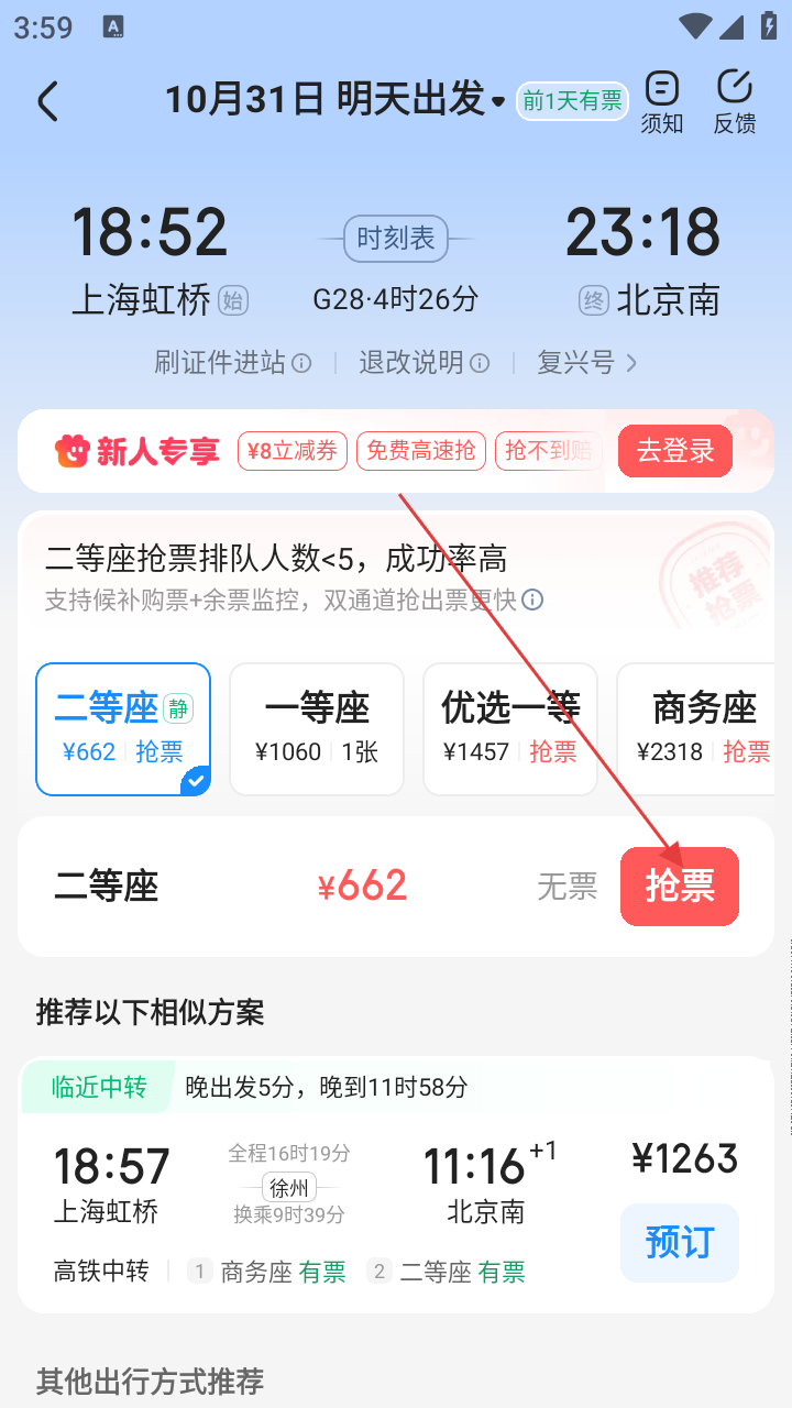 3、在车次详情页面,选择座位类型,点击【抢票】。