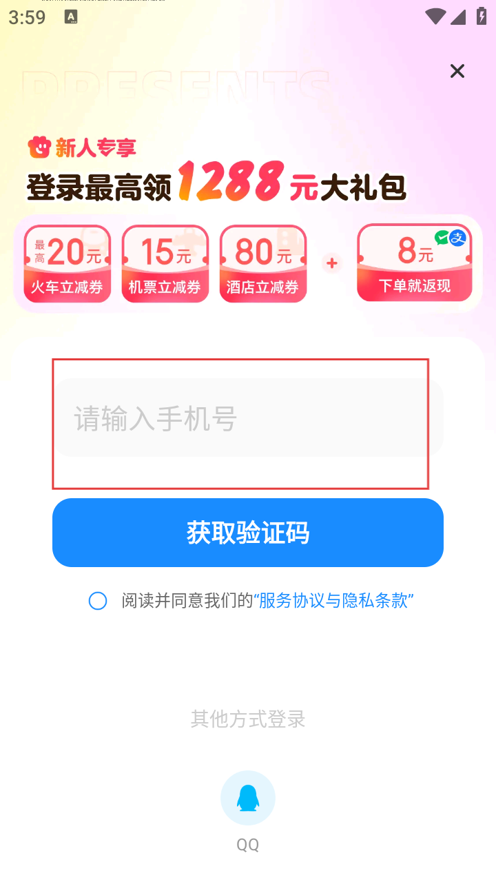 4、在登录界面,输入手机号码,勾选阅读并同意“服务协议与隐私条款”,点击【获取验证码】,输入验证码后完成登录,即可进行抢票操作。