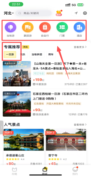 3、在河北地区页面,点击“门票”图标,浏览并选择一日游或多日游产品。
