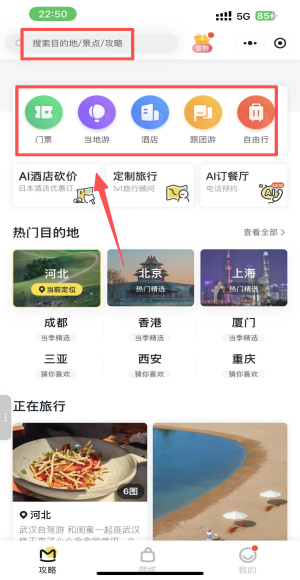 1、在搜索栏输入目的地,点击“门票”或“当地游”图标进行选择。