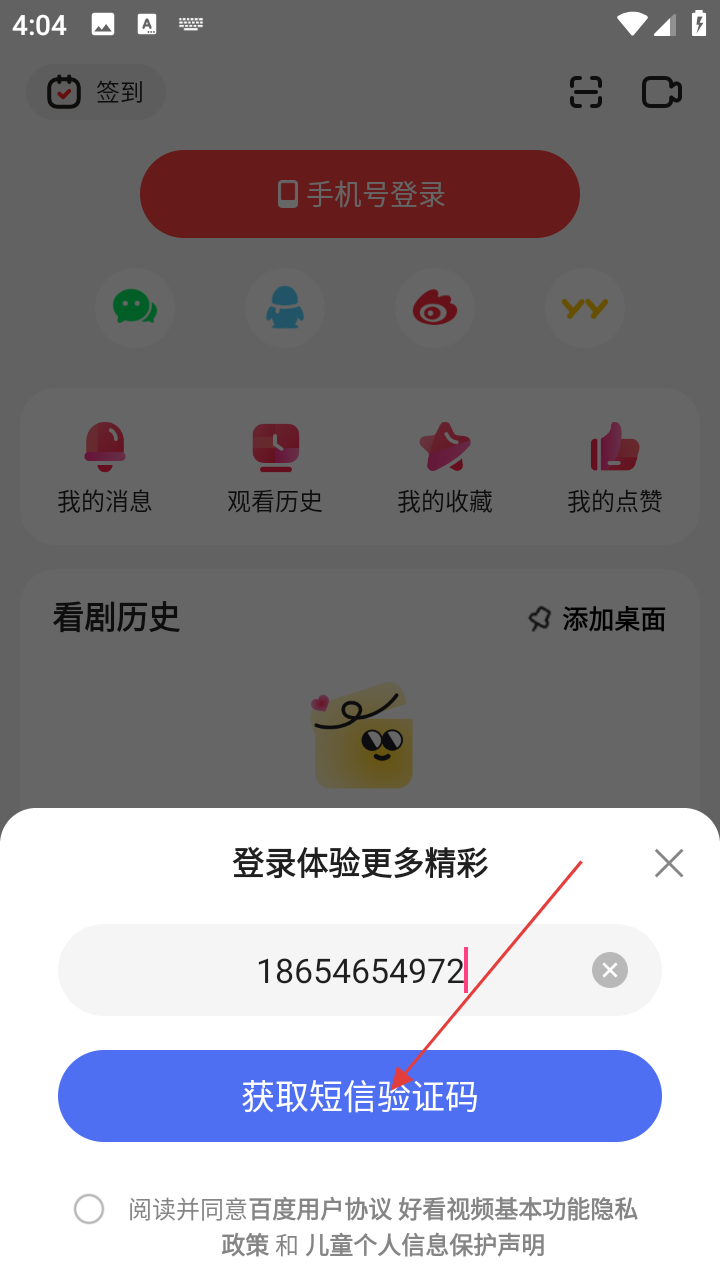 4、输入手机号码后,点击【获取短信验证码】按钮,等待接收验证码以完成登录。