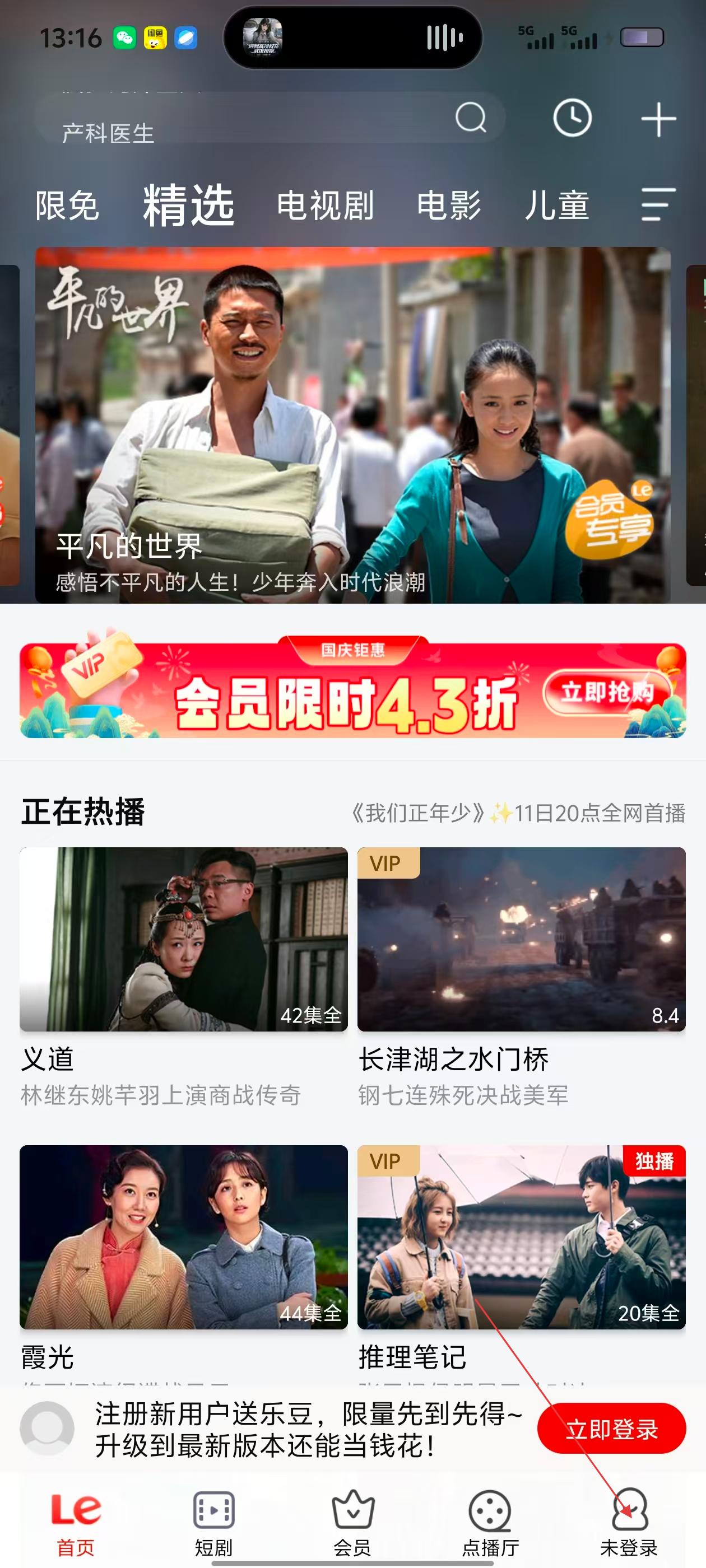 1、进入乐视视频首页,有【限免】【精选】等分类,还有会员限时4.3折活动,可点击【未登录】开启后续操作。