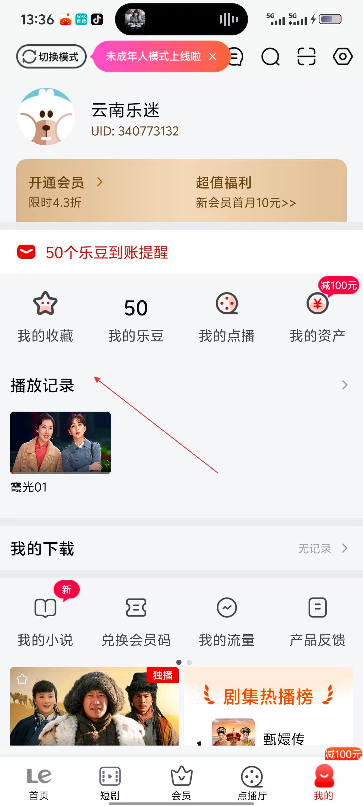 2、登录后进入“我的”页面,能看到【我的收藏】【我的乐豆】等功能,点击【播放记录】可查看观看过的内容。