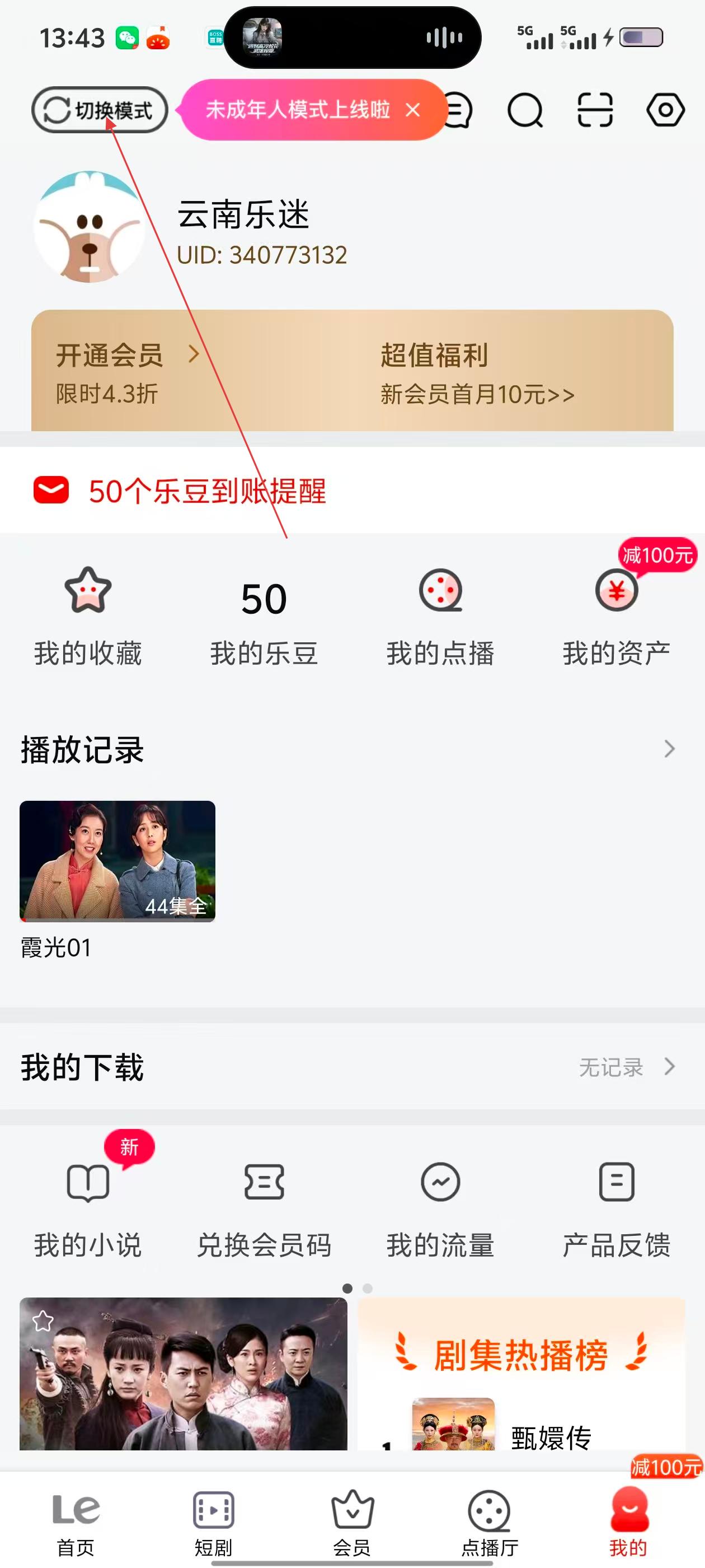 2、在“我的”页面,能看到【我的收藏】【我的乐豆】等功能,点击【切换模式】可进入模式切换相关界面。