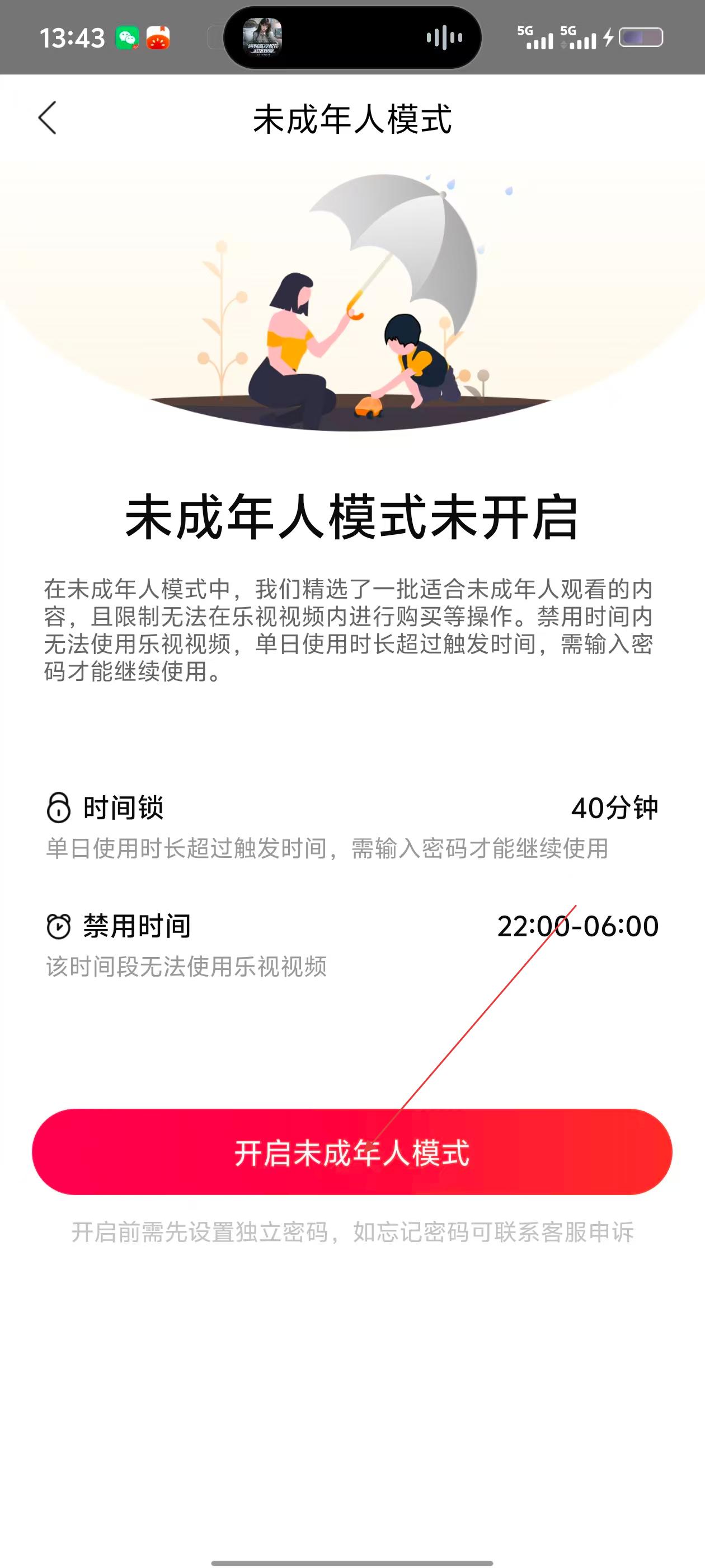 3、进入未成年人模式页面,可看到该模式未开启,点击【开启未成年人模式】,按提示设置独立密码即可开启。