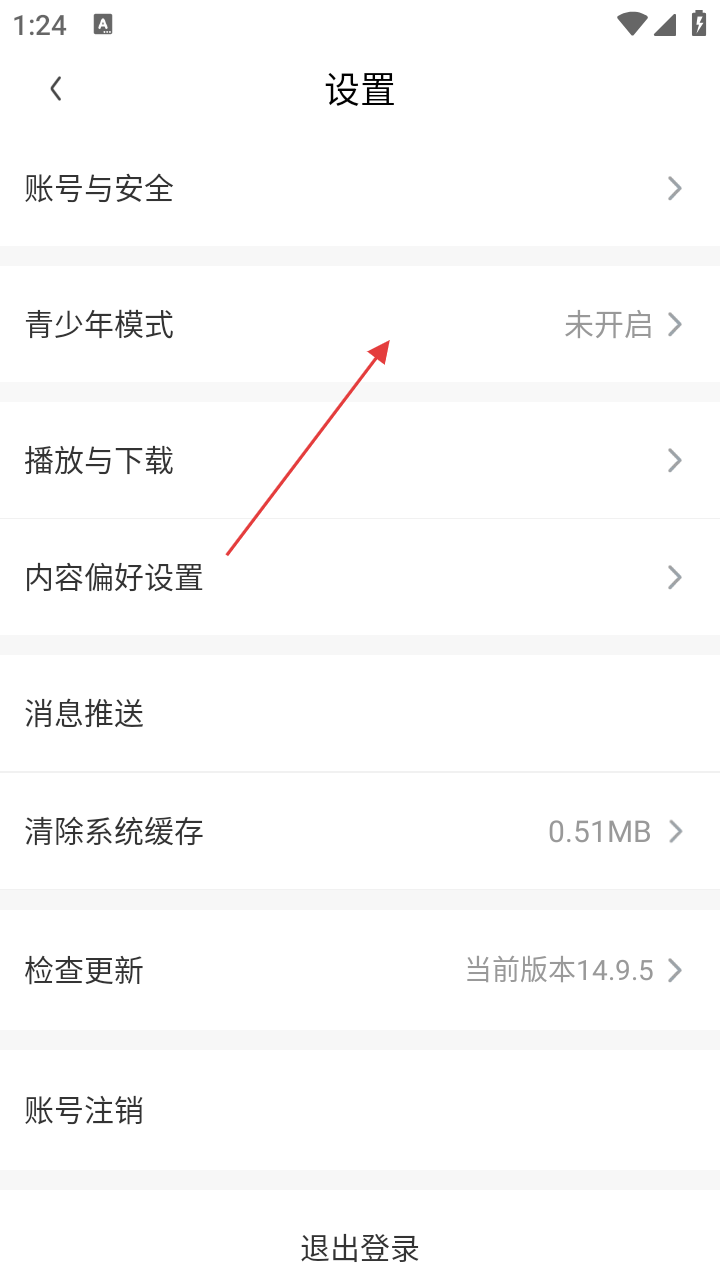 3、在设置界面,点击【青少年模式】选项,进入青少年模式设置页面。