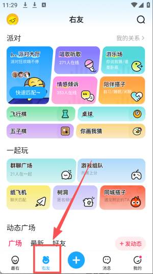 3、在右友页面点击“+”号,添加新的好友或加入活动。