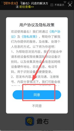 1、点击“同意”按钮以接受用户协议和隐私政策。
