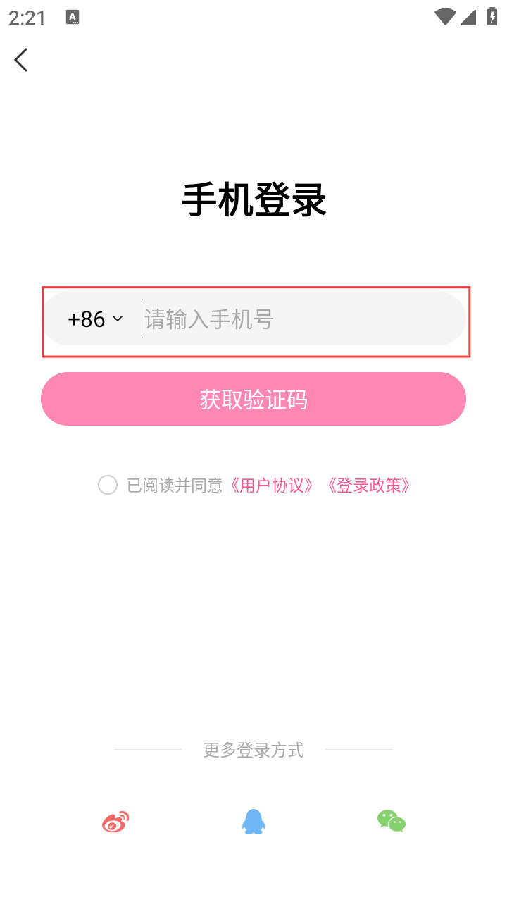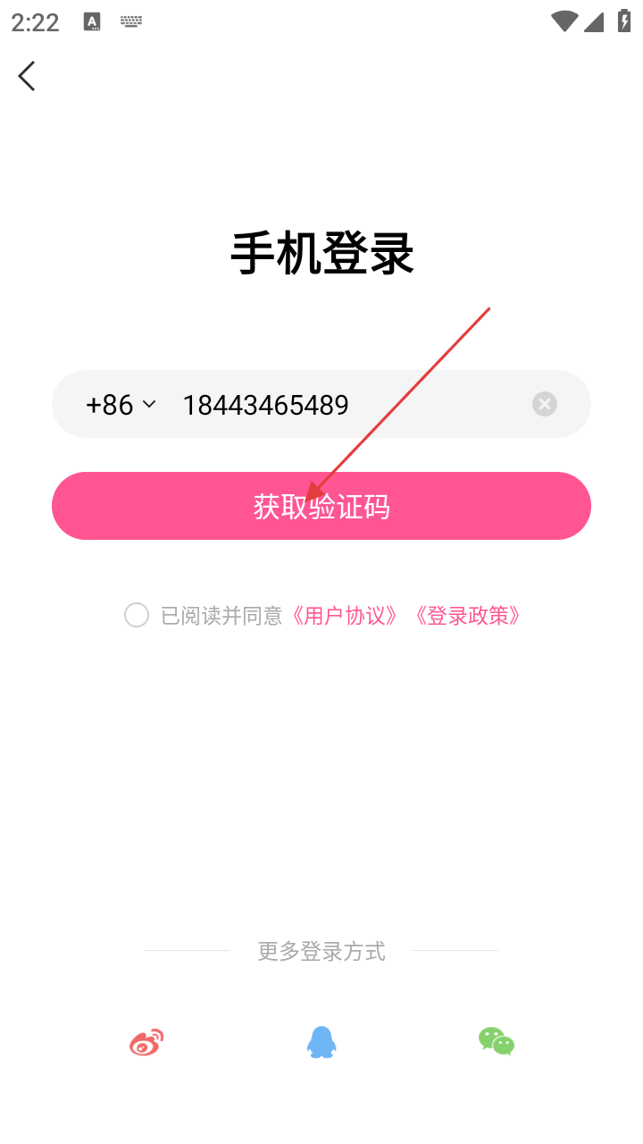3、在手机登录界面,输入手机号码,勾选已阅读并同意相关协议和政策,准备获取验证码。