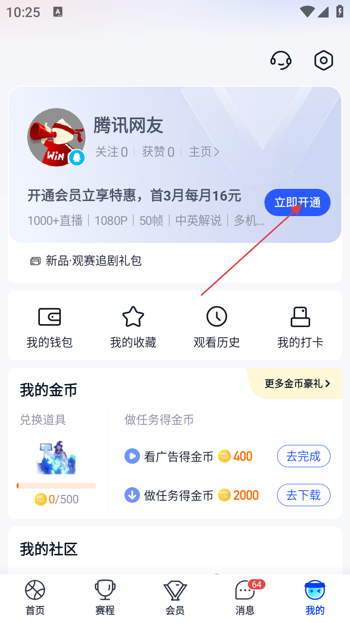 2、在个人页面,点击【立即开通】按钮,进入会员开通相关界面。