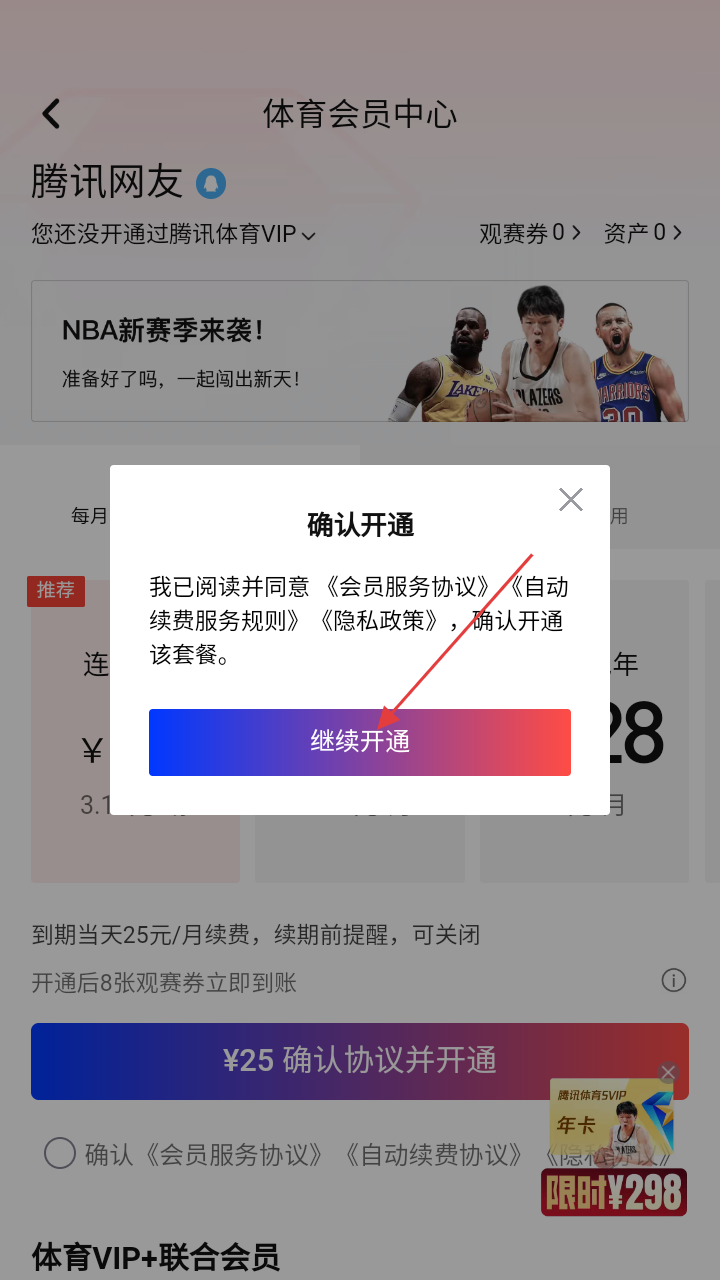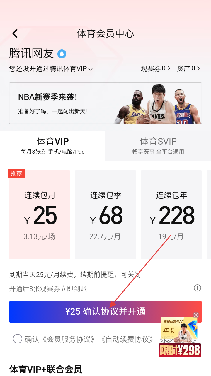 3、进入体育会员中心后,选择会员套餐,点击【¥25确认协议并开通】按钮。