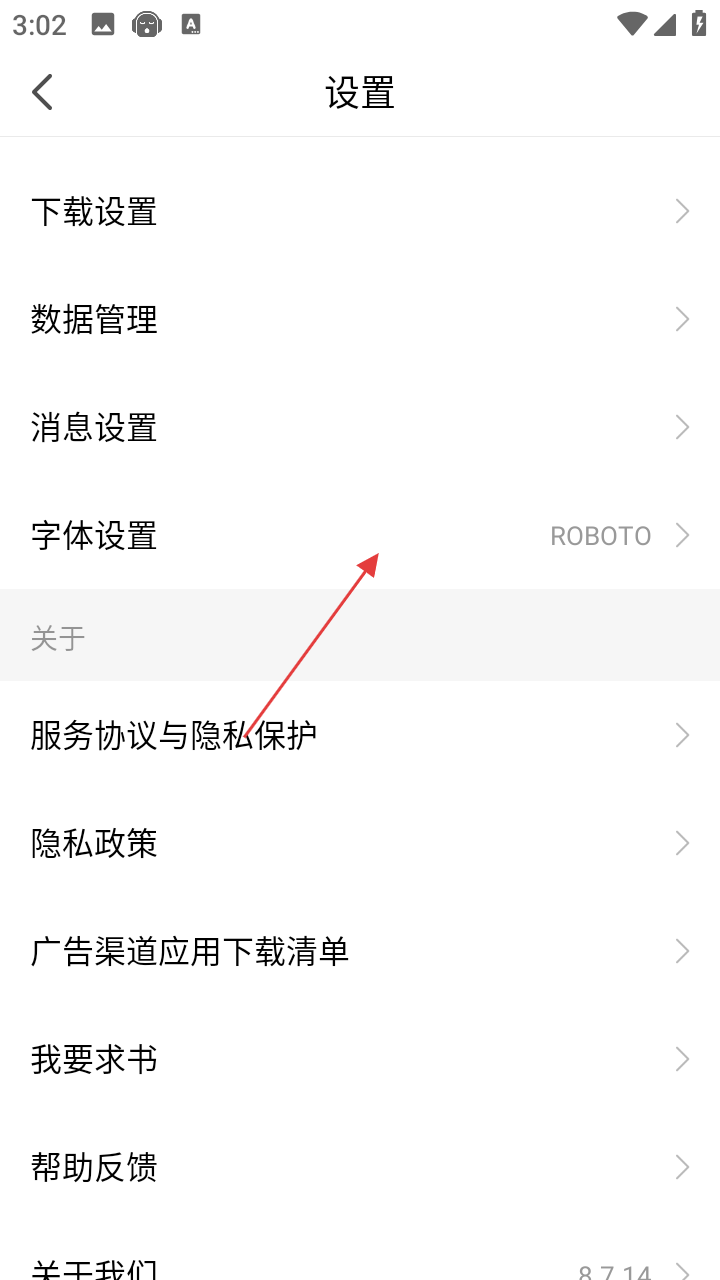 3、在设置页面,点击【字体设置】选项,进入字体设置页面。