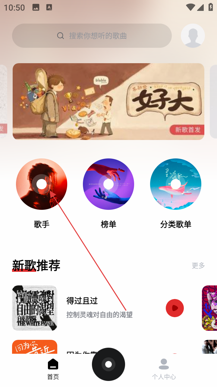 1、进入音乐软件首页,若想查看歌手相关内容,点击【歌手】图标。