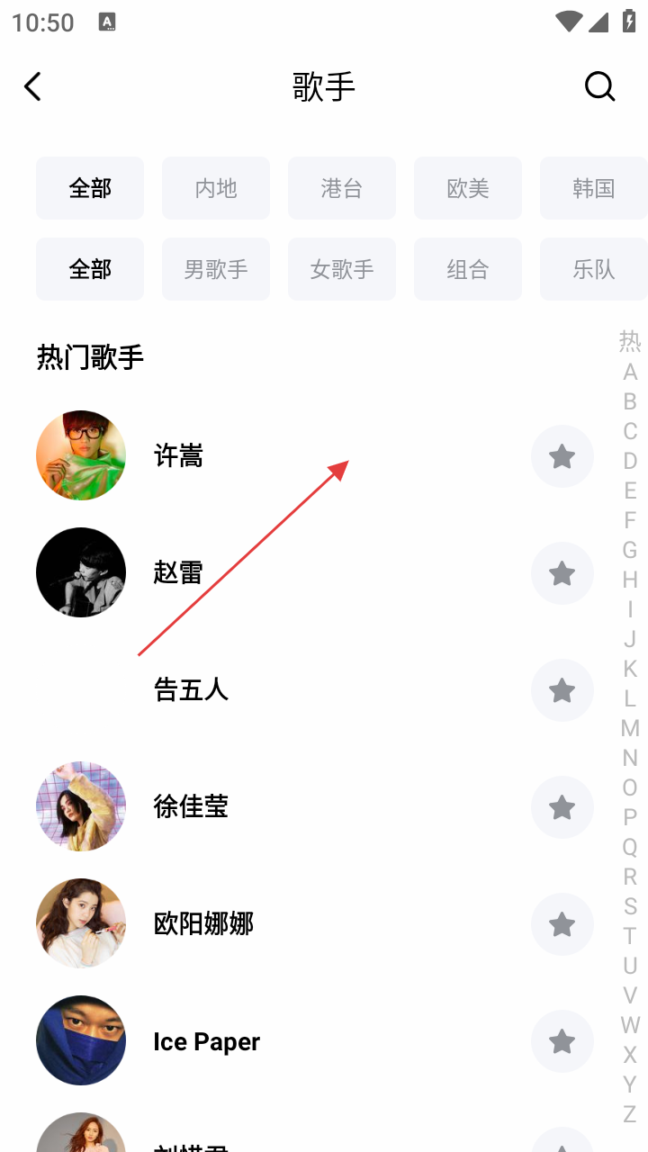 2、在【歌手】页面,可看到有热门歌手列表,若想听许嵩的歌,点击【许嵩】。