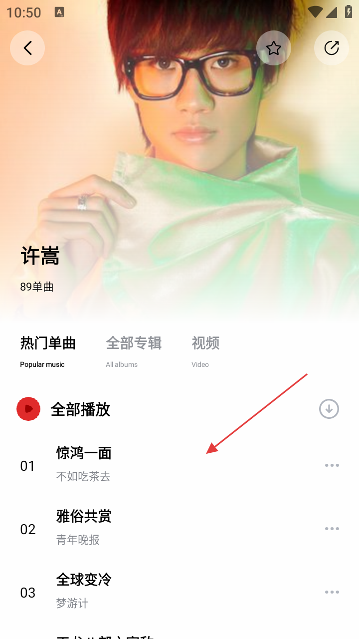 3、进入许嵩的个人页面,能看到热门单曲等分类,若想听《惊鸿一面》,点击该歌曲。