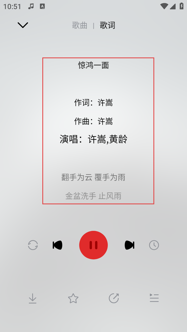 4、点击《惊鸿一面》后,进入播放页面,可看到歌曲作词、作曲等信息,还能进行播放控制。