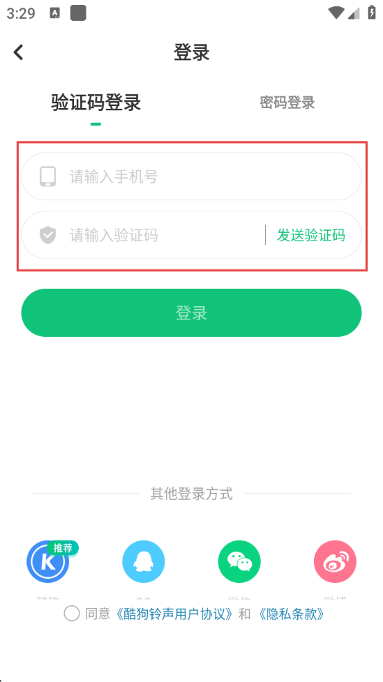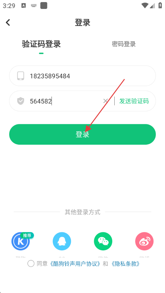 3、进入登录界面,选择验证码登录方式,在输入框中依次输入手机号和验证码。