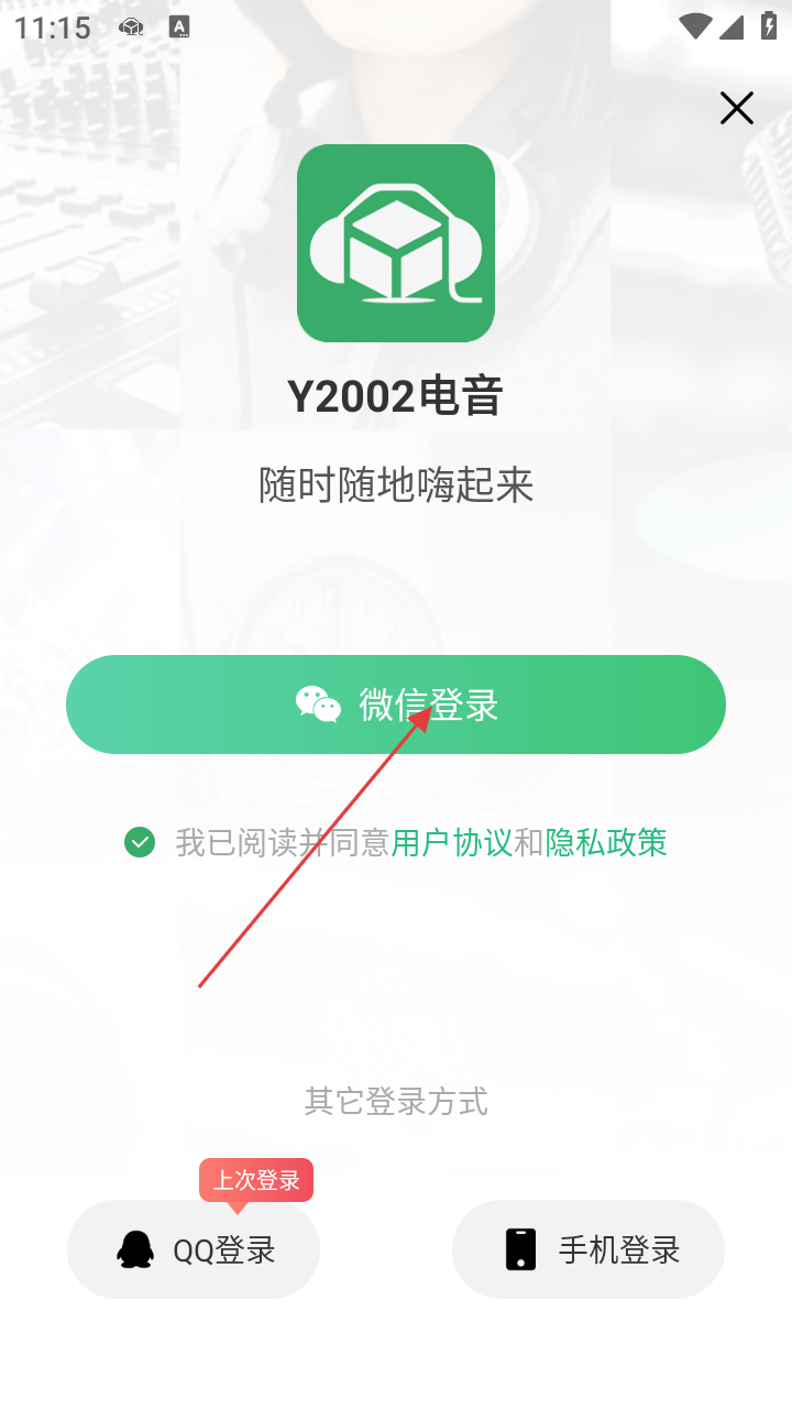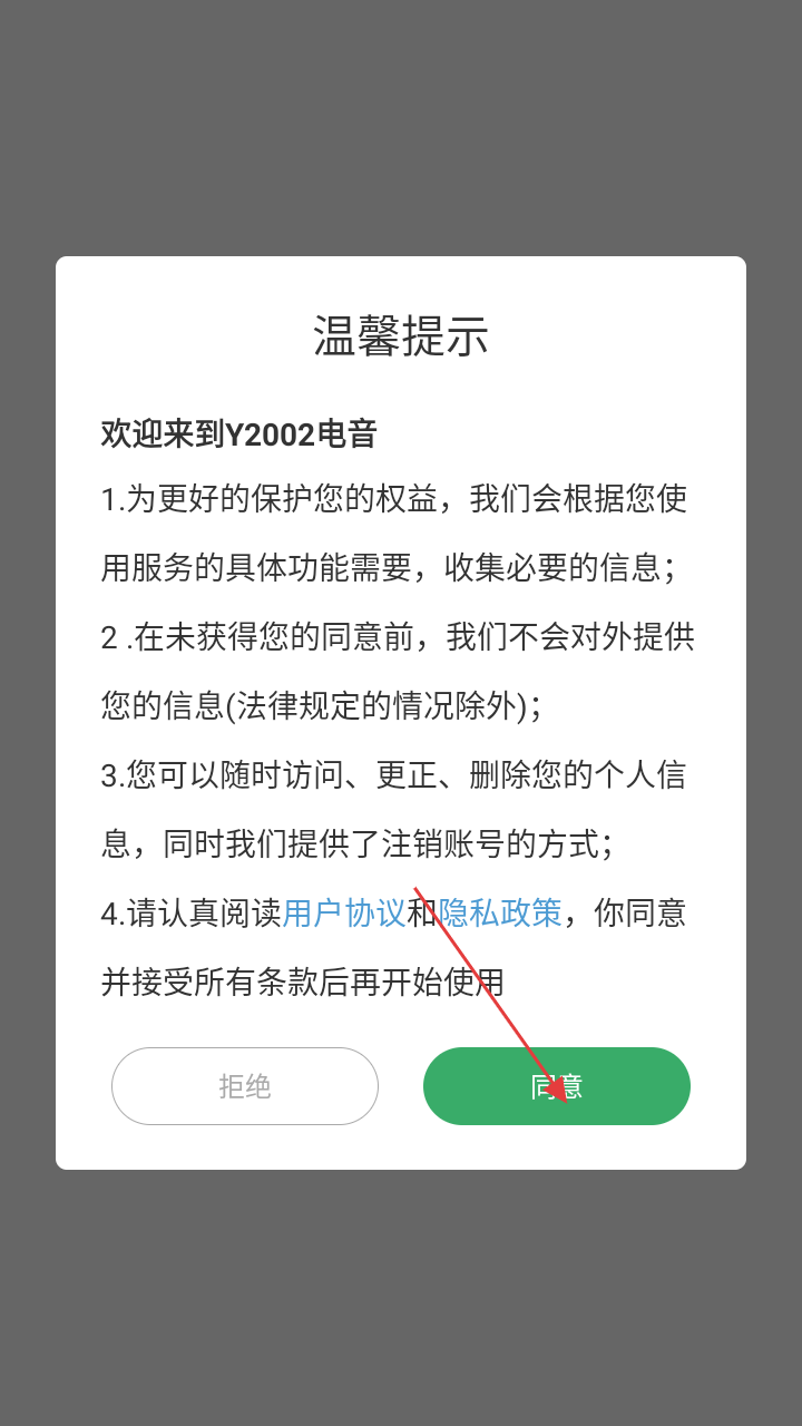 1、首次使用【Y2002电音】,会弹出温馨提示,认真阅读后,点击【同意】即可进入软件。