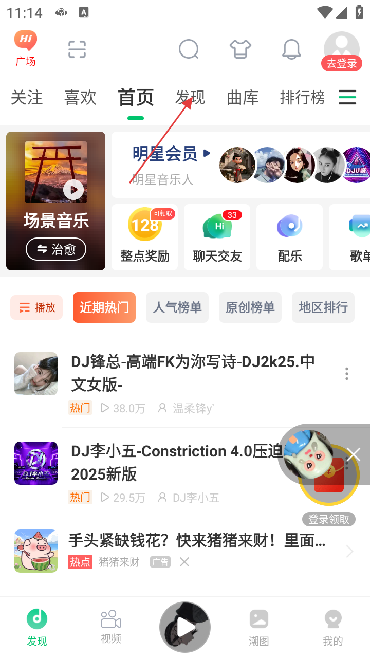 2、进入软件后,在首页上方导航栏,点击【发现】选项,可探索更多内容。