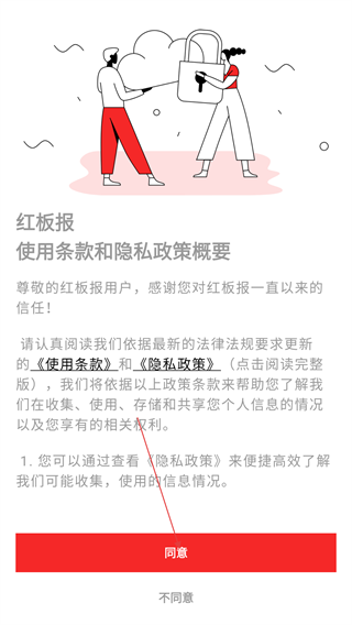 1、使用【红板报】前,需阅读《使用条款》和《隐私政策》,点击【同意】方可使用,以此了解个人信息收集使用等情况。