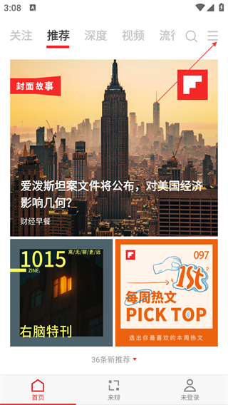 2、进入【红板报】首页,有关注、推荐等内容板块,可查看封面故事、财经早餐等资讯,点击右上角菜单按钮可进入管理界面。