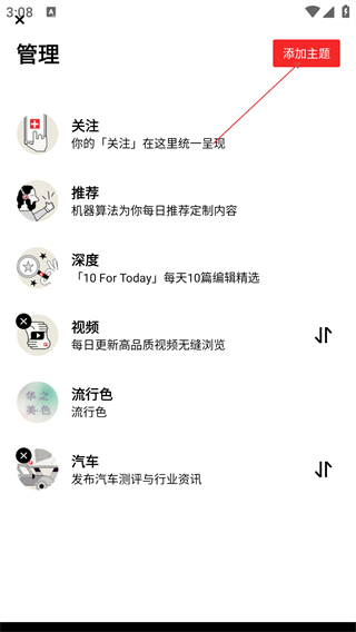 3、在【红板报】管理界面,有关注、推荐等内容板块,点击【添加主题】可自定义感兴趣的内容主题。