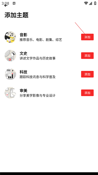4、在【红板报】添加主题界面,有音影、文史等主题分类,点击对应主题的【添加】按钮,即可添加该主题内容。