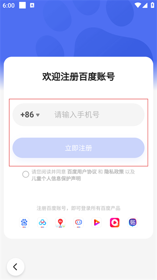 4、注册百度账号时,选择【+86】地区码后输入手机号,勾选协议即可点击【立即注册】完成账号创建。