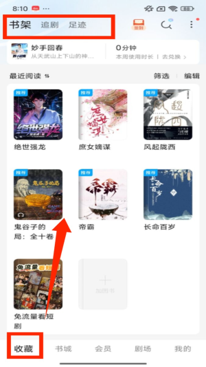 1、打开应用后进入 “收藏” 页面,顶部有 “书架”“追剧”“足迹” 标签,下方展示最近阅读的书籍列表。