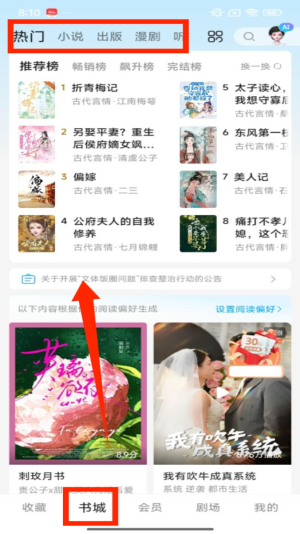 2、点击底部 “书城” 选项,进入后顶部有 “热门”“小说” 等分类,还能看到推荐榜里的各类书籍。