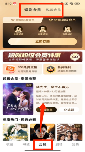 3、切换到底部 “会员” 页面,顶部有 “短剧会员”“悦读会员” 标签,可看到会员专属的短剧推荐内容。