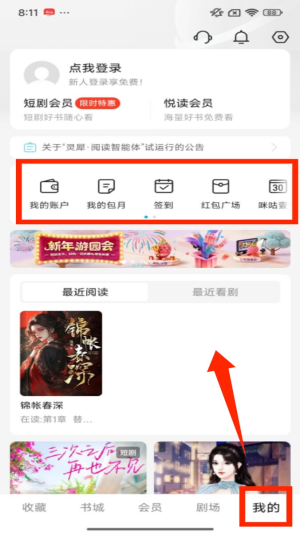 4、点击底部 “我的” 选项,进入个人页面,能看到 “我的账户”“我的包月” 等功能入口及最近阅读记录。