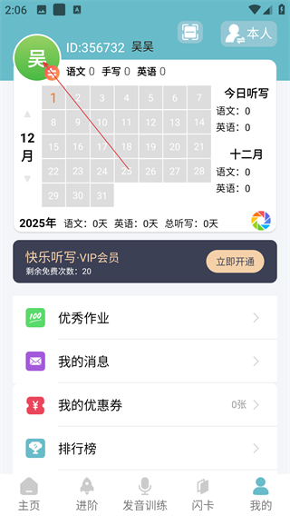 2、进入【我的】页面可查看听写数据,点击头像旁切换按钮,可进入账号切换界面,管理当前学习账号信息。