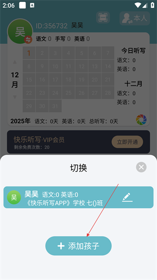 3、在切换界面可查看当前账号信息,点击【添加孩子】按钮,可新增其他学习账号,方便多账号管理使用。