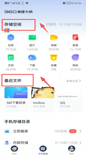 2、查看“存储空间”和“最近文件”以了解手机存储使用情况。