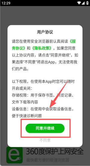 1、打开安全浏览器,点击“同意并继续”完成权限授权。